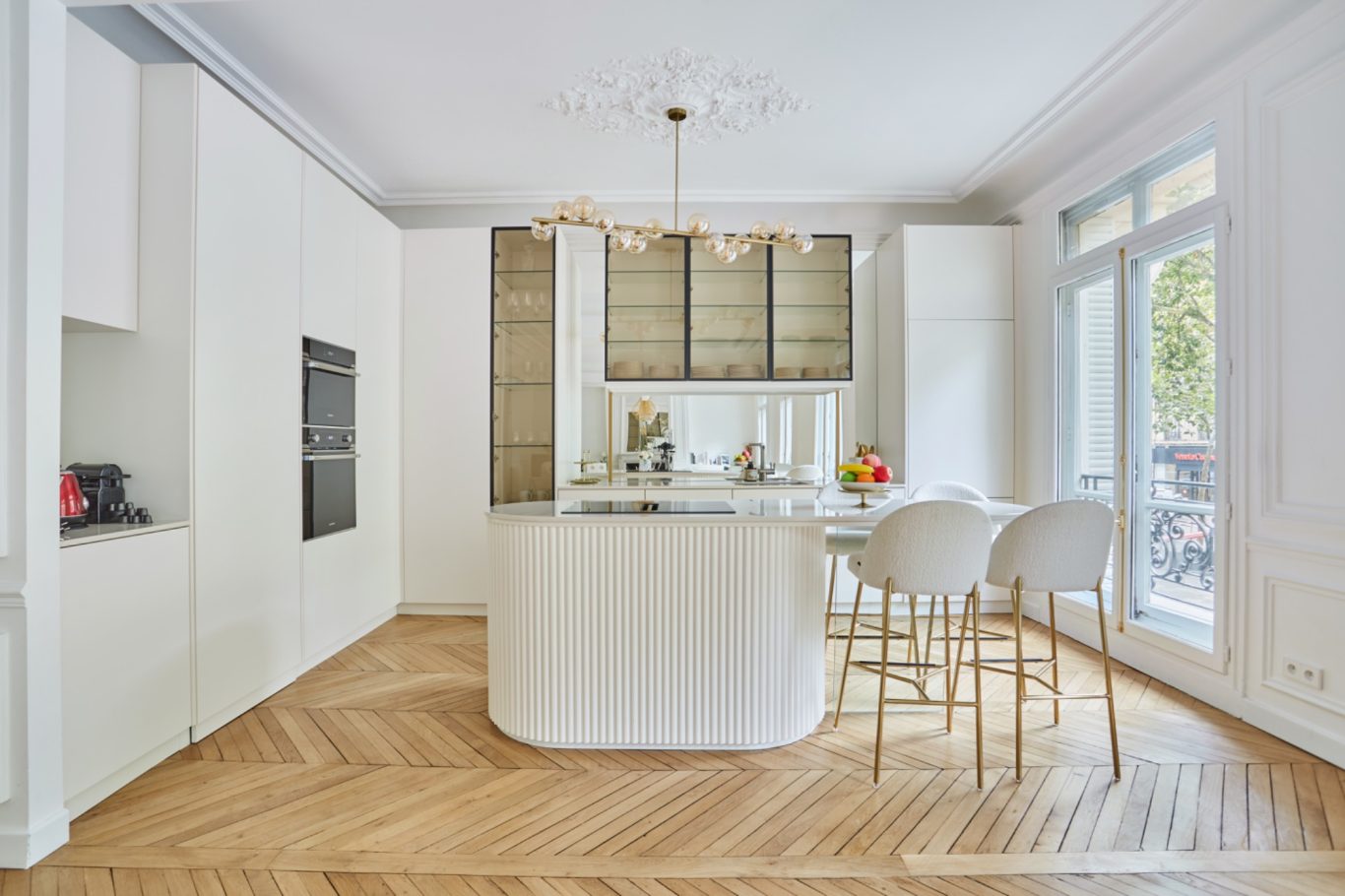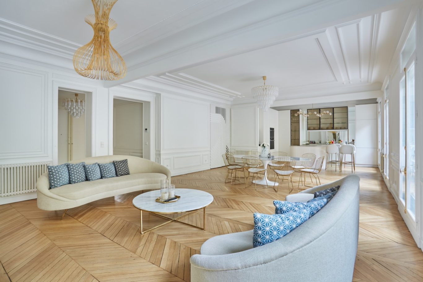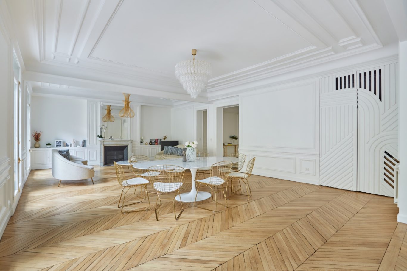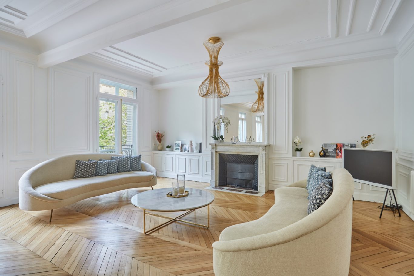 Cet appartement a fait l'objet d'une rénovation haut de gamme mettant en valeur les parquets et les moulures.